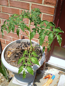 I'm never surprised to find volunteer Tomato plants springing up in different parts of the garden, but this one somehow grew all by itself in a planter on the front porch!