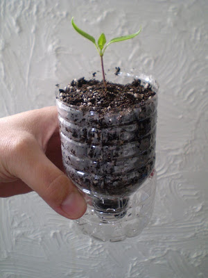 I just followed the instructions (more or less) from this flickr tutorial. I know I didn't do all the steps right- my reservoir is too short and the top half doesn't fit in snugly and I don't have enough air holes, nor are my cuts nice and tidy- but hey! I have a plant growing in there! and next time I'll do better.