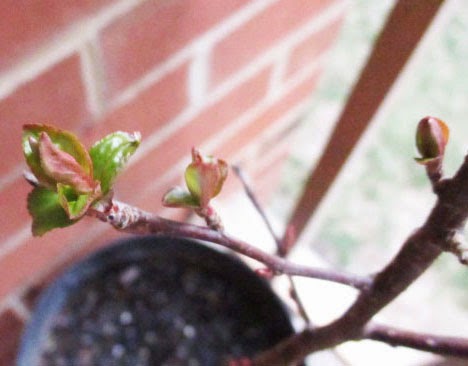 The Dogwood sapling is putting forth new leaves.