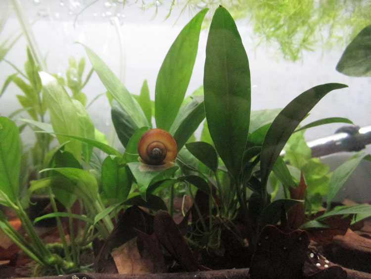 or the underside of leavesI never thought I'd be so taken with a snail... if it decides to eat plants, well I hope it goes for the subwassertang and leaves the buces alone. I can't imagine it would munch on tough anubia or java fern.