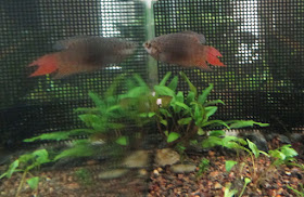 There is still no trouble between M. Beautiful and the black skirt tetras- and I do think their presence is having a positive effect! Angelfish is beginning to act much calmer. Half the time he comes eagerly to the front waggling tail in anticipation when I walk downstairs- other times he still startles or turns away, but doesn't go pale as often, doesn't crash around in a panic anymore.