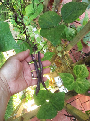 Still, it's lovely to see the pole bean foliage all up the deck railings. I really like the effect, and will repeat it. Just have to figure out how to keep the plants healthier- I though it was mostly mites harming my green beans- but found stink bugs when I started cutting off the worst-looking leaves. Since I've been dousing it with dishwater, newer leaves look better condition, so I'm cutting more of the old ones off.