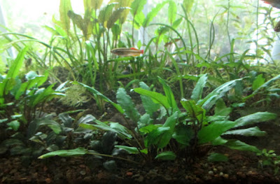 Over a week ago I got some dwarf saggittaria from a fellow aquarium keeper, through the mail.For years I never thought of trying this in my tanks. People use it in high-tech setups to make a carpet filling in the foreground substrate. But I learned recently that it can grow fine in a low tech setup, it will just get taller- which is what I want! - and it can also do okay with temps down into to the low sixties. Max height is twelve inches, so this might work perfectly in my unheated window tank.I planted it in the middle, where all the weighed-down hornwort stems have finally come out. Same as last time, I floated the plants for a good long while with occasional additions of tank water to the bag, to give them a gradual acclimation. I haven't seen any melt. I expect them to grow rather slowly, at least until summer comes again.