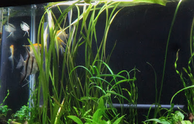 I have to say I'm very happy to see the festivums in there, among the plants. They hang out together more than I'd expected.Festivums and angelfishes don't bother each other at all-Later in the evening, Miss Beautiful gave up staking out her corner but chased the golden sisters around a lot- establishing herself as dominant. This morning all is calm again. My husband even remarked on it and I said "well, they don't really have anything to fight over anymore"- no mates or eggs. He asked if they might find that frustrating- probably, I suppose. I wonder if some of the females will eventually lay eggs anyway, Miss Beautiful never did on her own but I've heard of it happening with female angelfish companions. . . This morning trying to figure out why the temperature dropped in the tank. From 80° to 77°. I don't remember adjusting it down yesterday? I checked- the thermostat on the heater still set at eighty. I checked the cords (my cat climbed into the tank stand last night)- nothing was loose. I thought the power might have gone out briefly last night, but no clocks were blinking, and wouldn't the heater have brought the temp up again anyway? There was one aponogeton leaf touching the heater- I can't imagine that would affect how well it warms the tank (might just damage the leaf) but I reached in and moved it just in case.